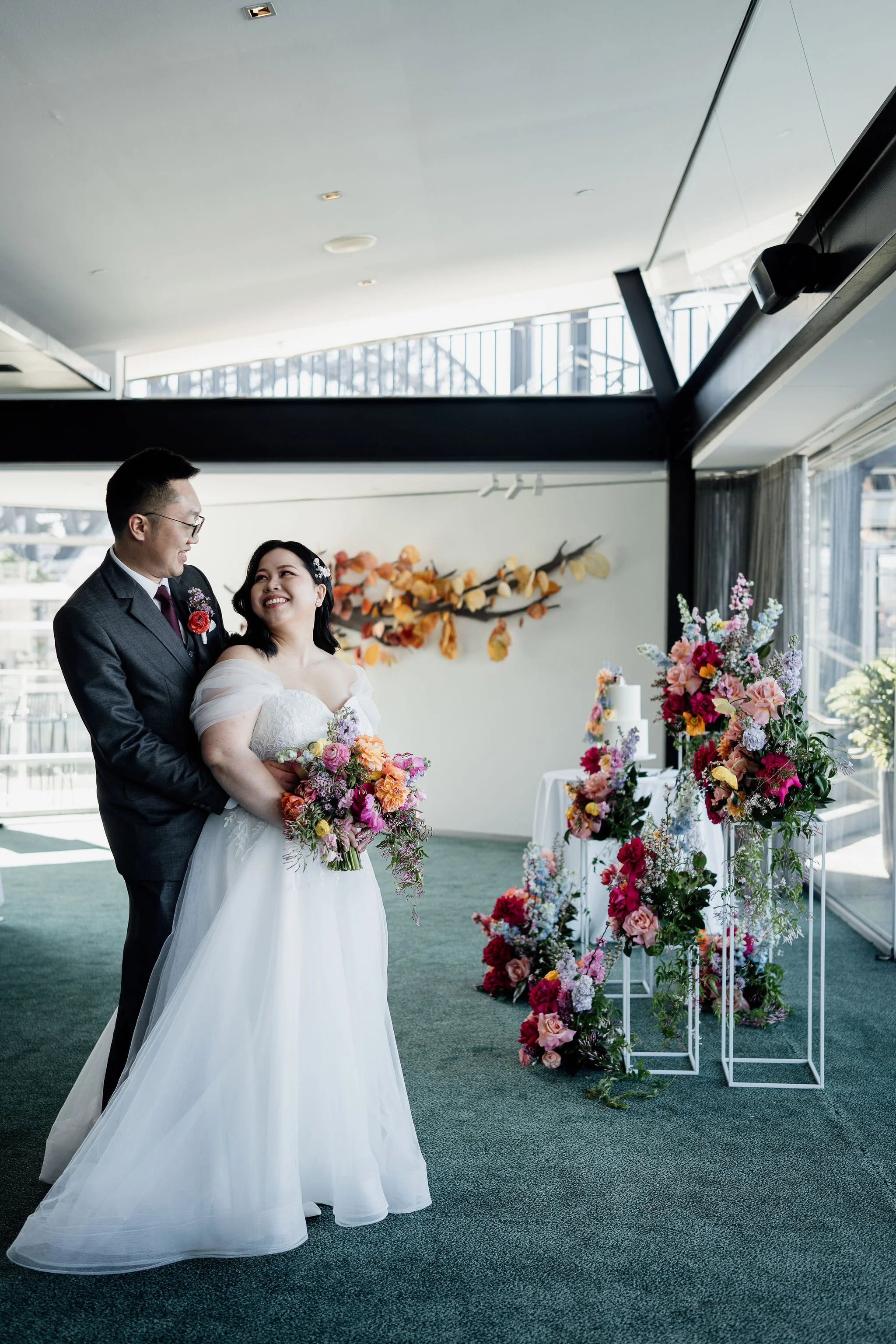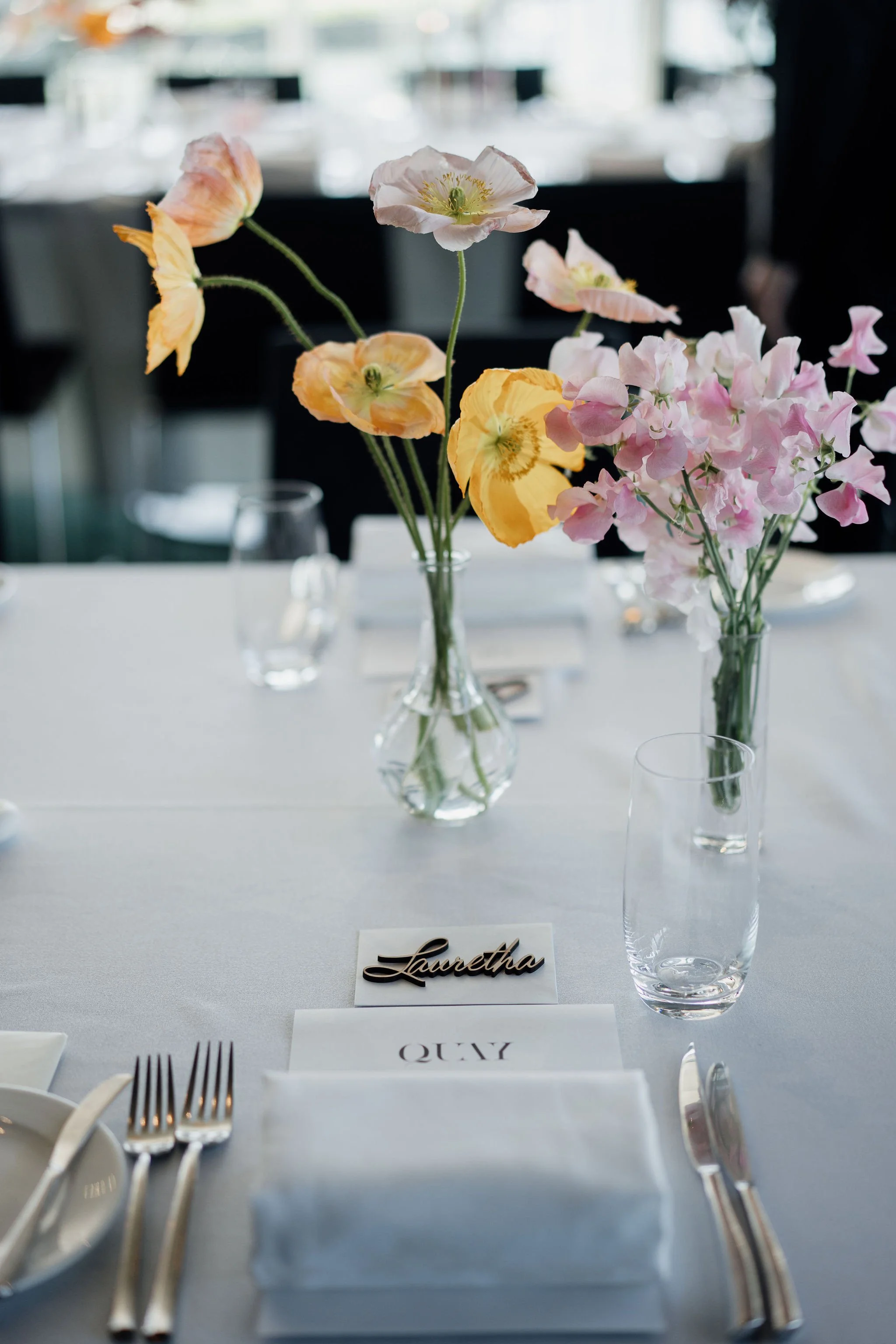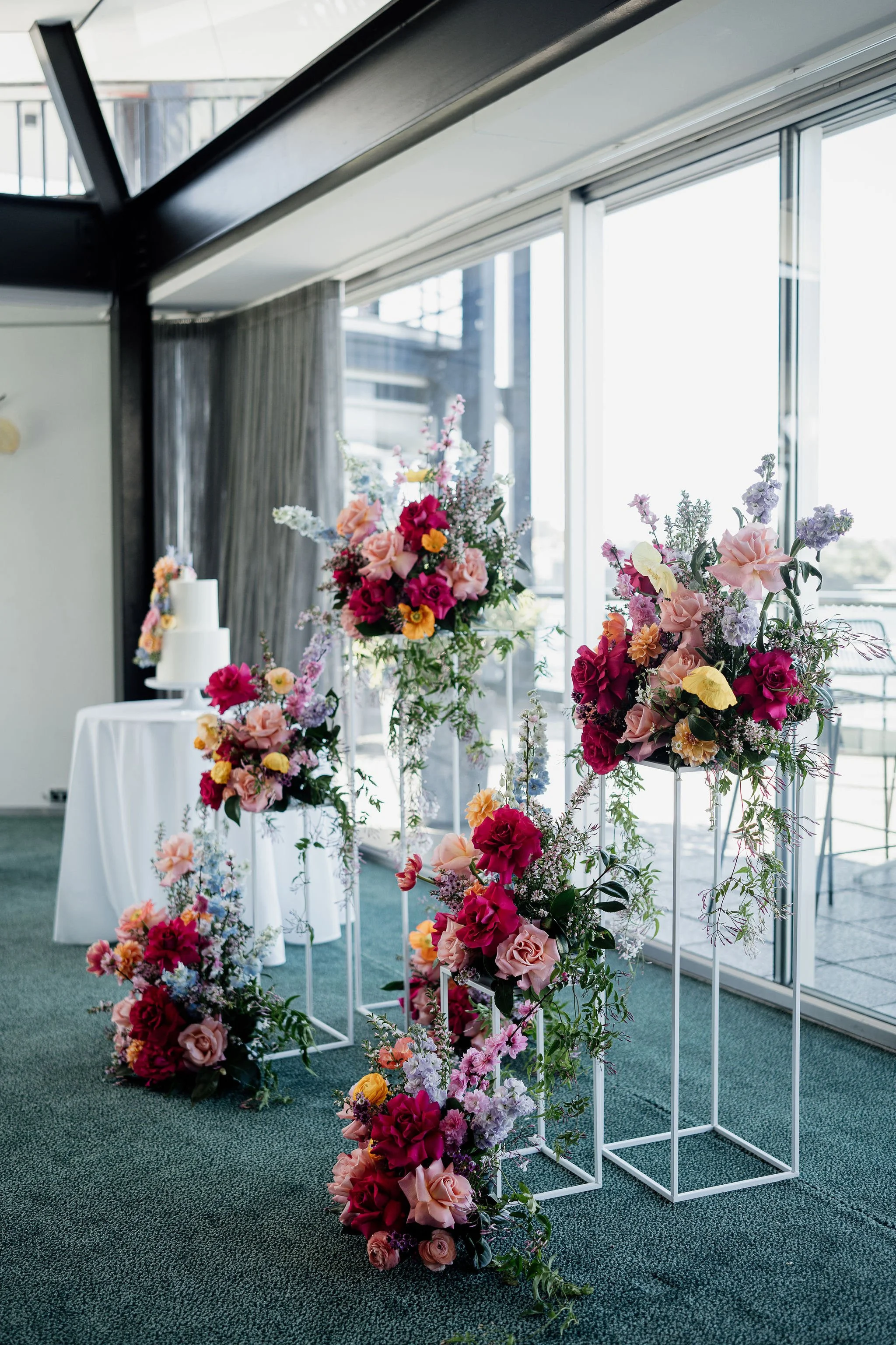 With spectacular views of the Opera House in the background, Lauretha & Chung Park celebrated in style with their vibrant garden party reception. We styled the Quay Restaurant with bud vases, colour taper candles and plinth arrangements for the perfect photo opportunity.