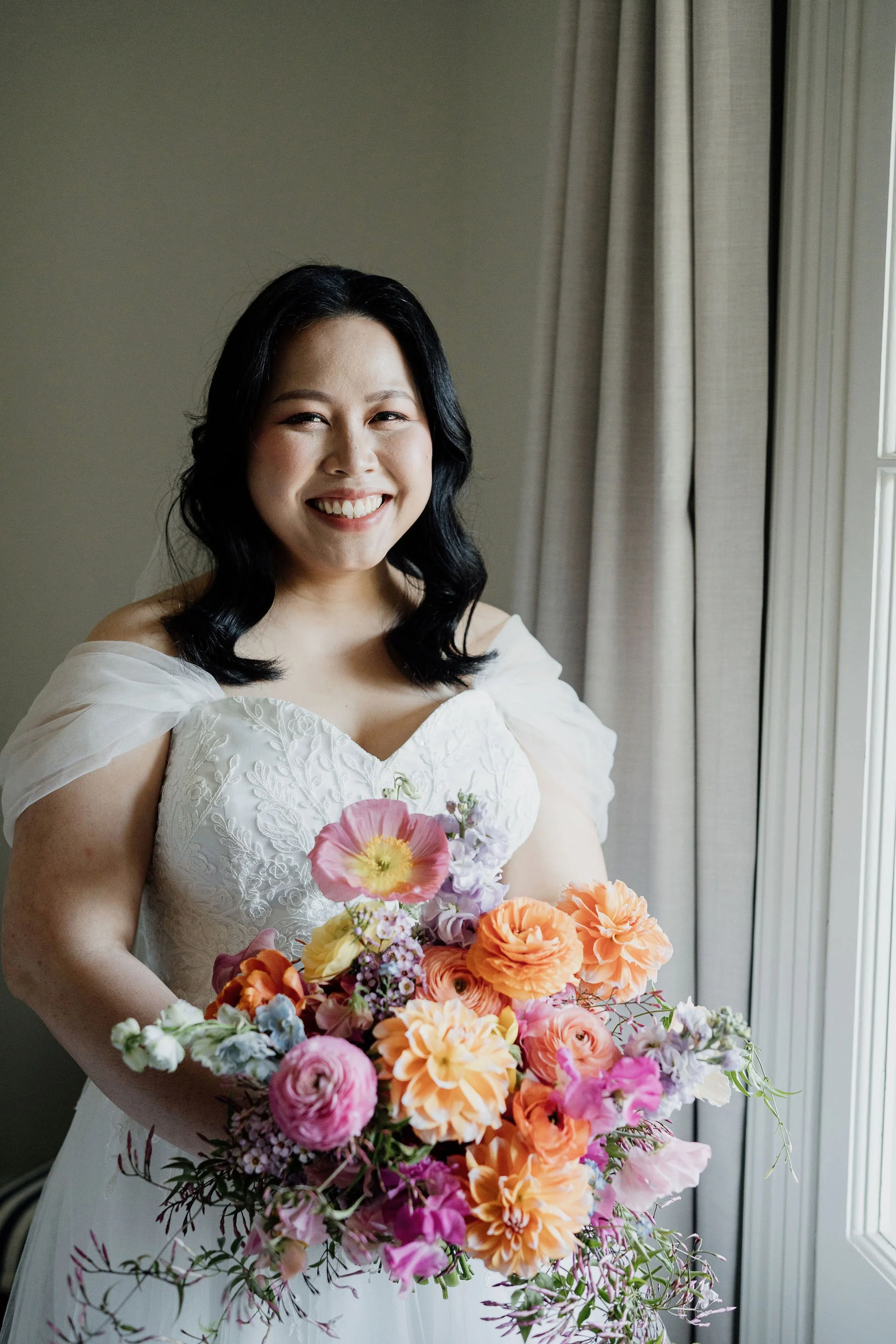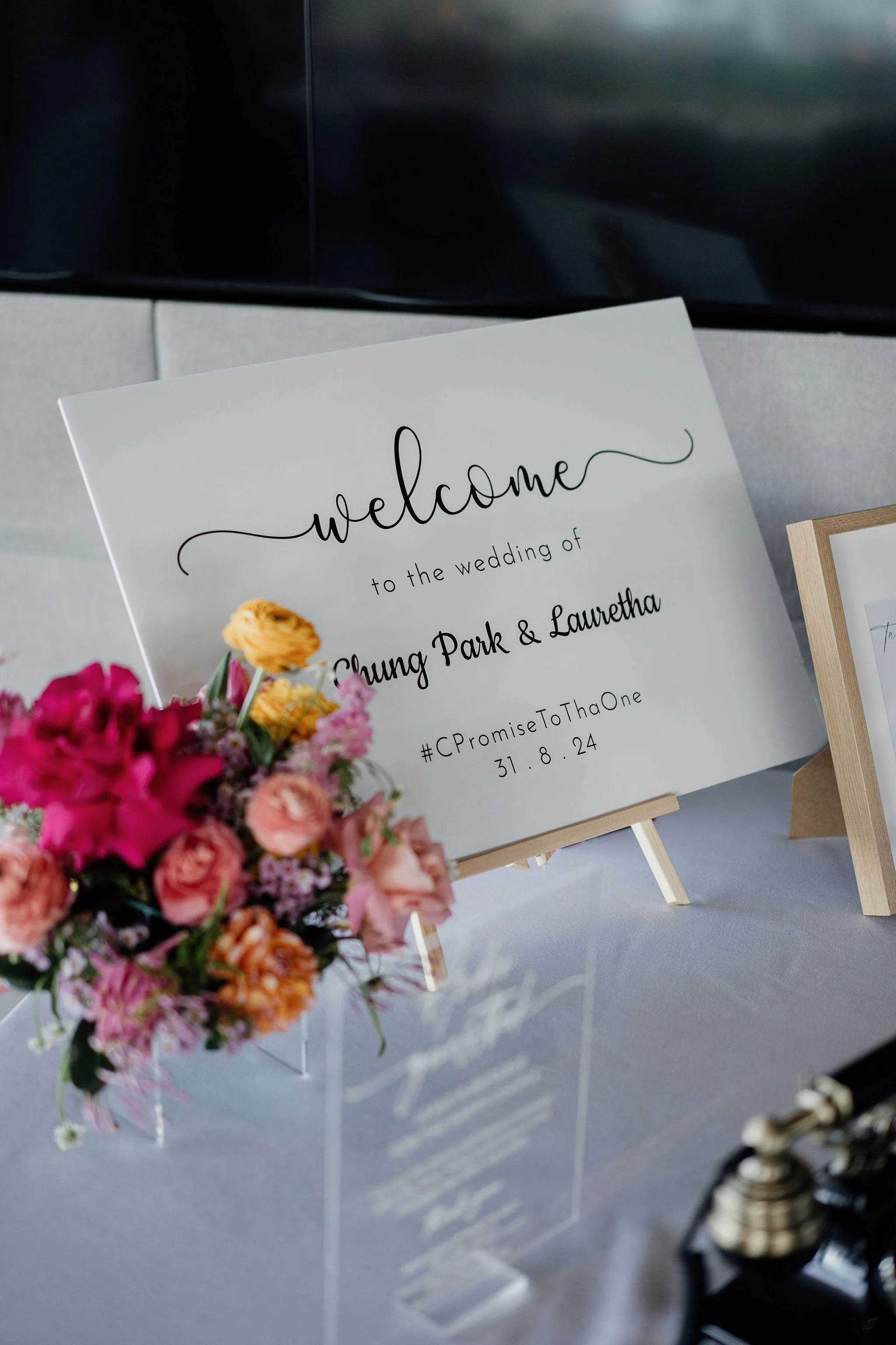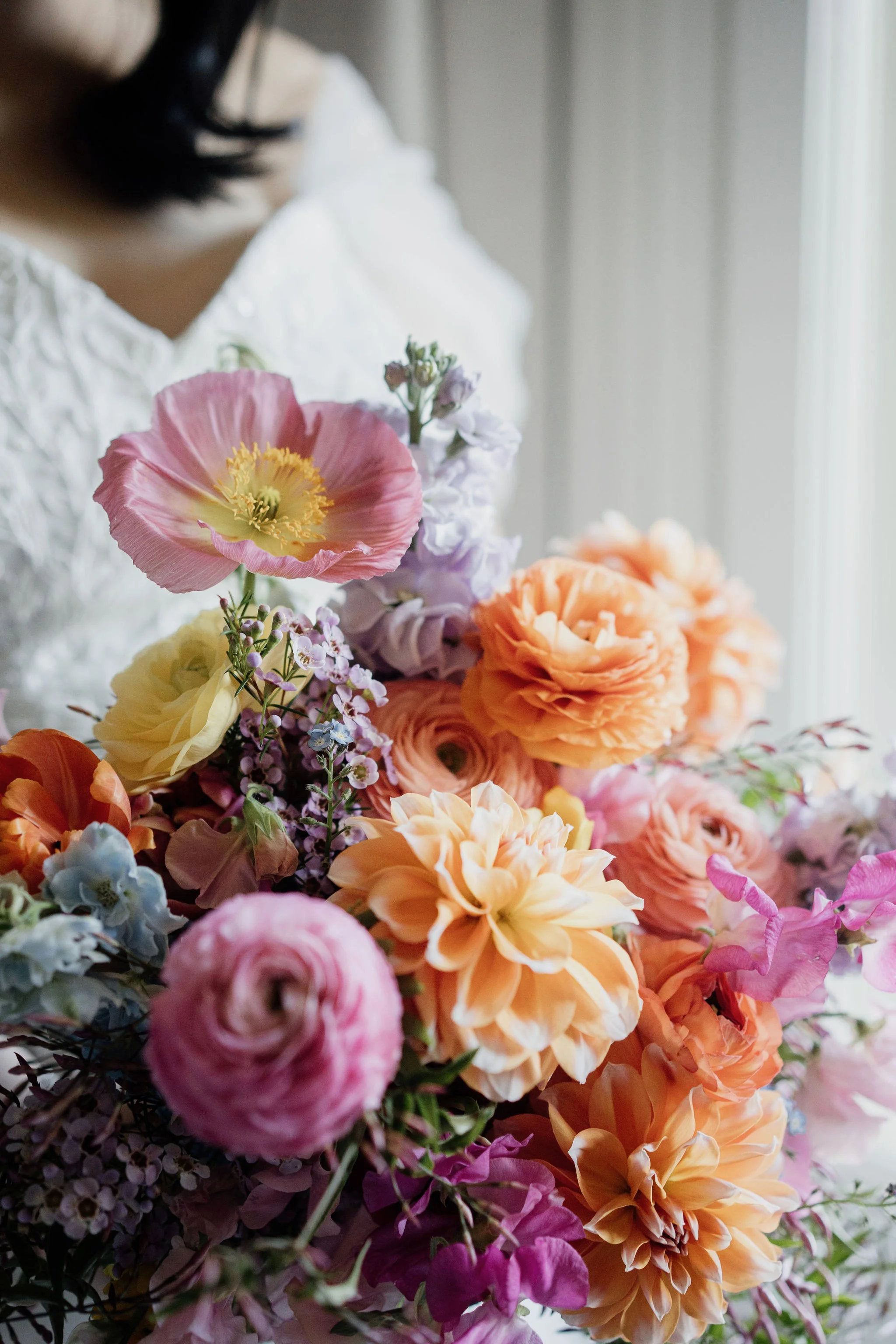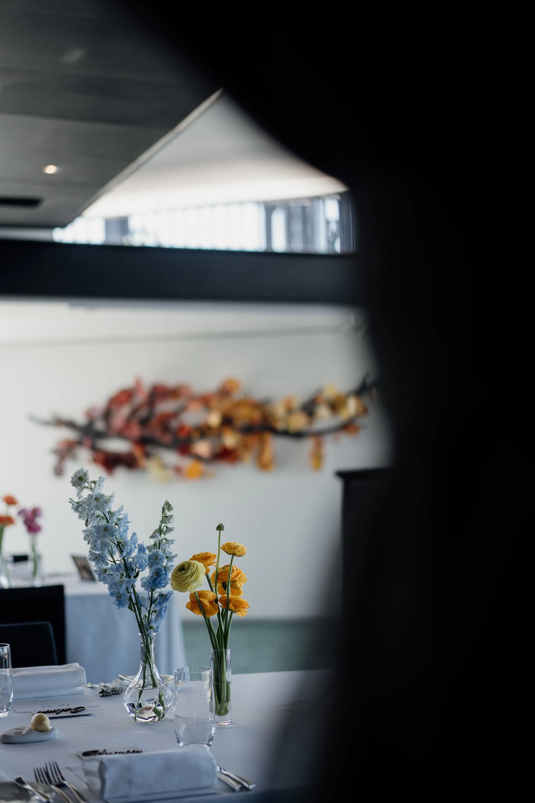 With spectacular views of the Opera House in the background, Lauretha & Chung Park celebrated in style with their vibrant garden party reception. We styled the Quay Restaurant with bud vases, colour taper candles and plinth arrangements for the perfect photo opportunity.